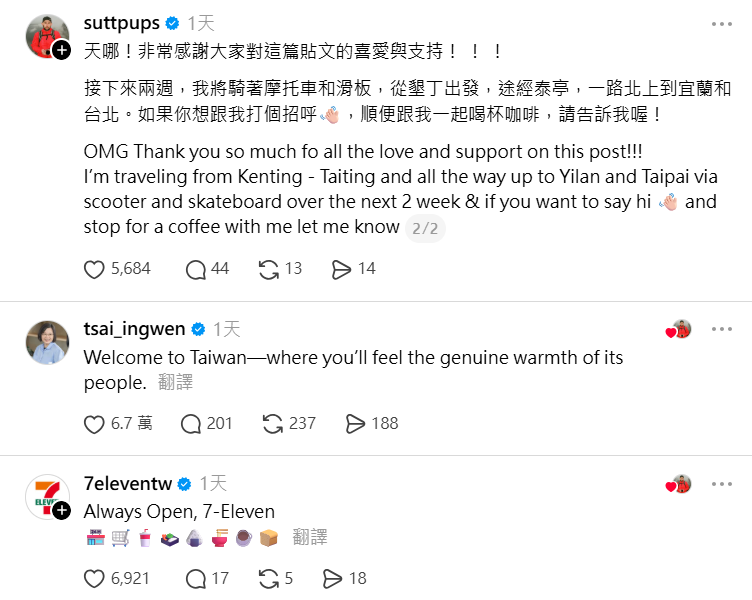 令薩頓驚喜的是,蔡英文海巡到這篇貼文,特地用英文留言歡迎他「在這裡,你會感受到人民的真誠溫暖,」薩頓則回覆謝謝,「我來這裡是為了旅行,但這裡人們的友善將永遠銘刻在我的記憶中。我會盡我所能把這份美好分享給全世界」。