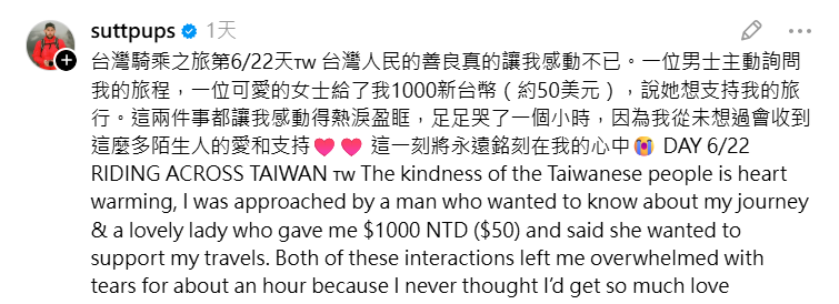 薩頓表示,環島期間,自己也遇到很多熱心的台灣人,有人給他水和食物,也有人資助他,他也為此收穫很多精彩對話。