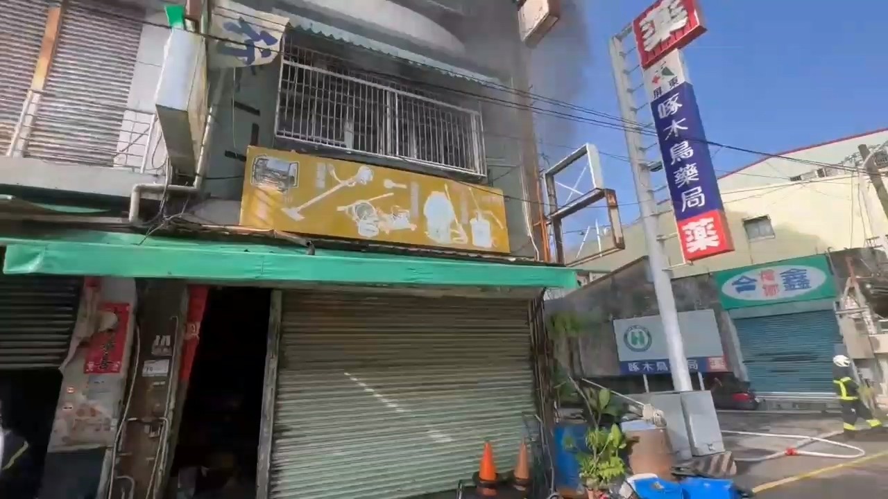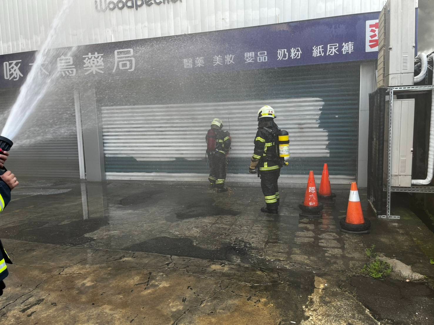屏東縣屏東市2日發生店家火災,波及藥局,一旁加油站戒備。讀者提供