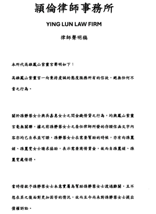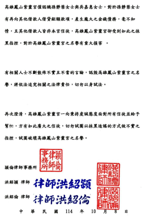 另外,紫靈宮今天也發聲明表示,孫女士之家屬對高雄鳳山紫靈宮之指控,全非屬實,均為惡意之抹黑造謠,且對於稍早不理性之行為表達譴責。同時廟方也出示律師聲明,「高雄鳳山紫靈宮絕對會頃一切力量捍衛名譽,拒絕惡意的抹黑造謠,母娘仍會秉持著幫助大眾的想法,帶領所有信徒前進。」