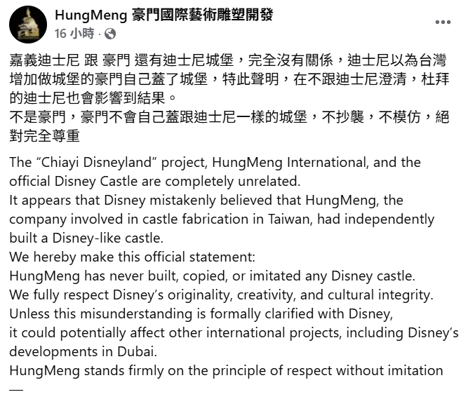 建築公司豪門國際發布澄清聲明,表示公司與「台版迪士尼」無關。翻攝豪門國際FB