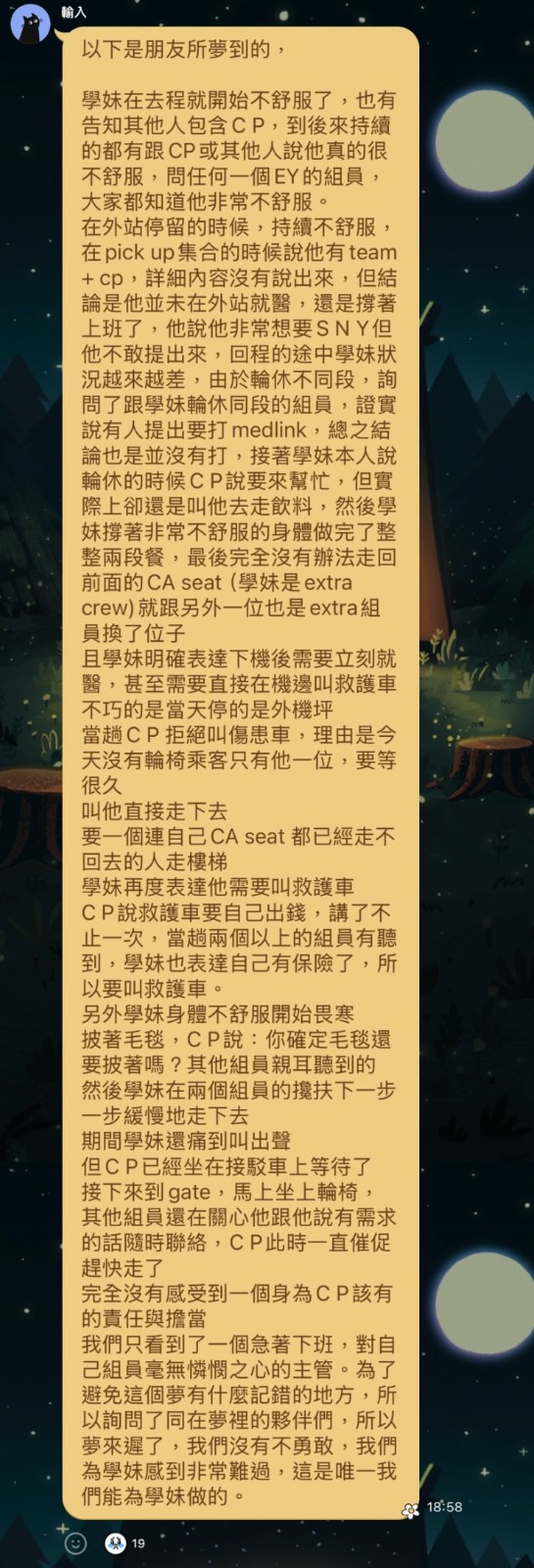 空服員也說,學姊每步都很痛苦,甚至有幾階是必須痛到喊出聲音來的,走幾步就需要休息一下,他趕緊下到接駁車放好自己行李,再跑回去幫忙其他2位同事,想說可以輪流背學姊,「但因為她身體已經到達有點無法控制的程度,所以她太害怕跌倒以致於不敢讓我們背。」
