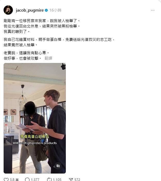 Jacob昨日在社群平台上傳影片表示,他返抵台北後,突然出現移民官到他家訪查,通知他被人檢舉,並於影片中無奈表示「剛剛有一位移民官來,說我被黑粉匿名檢舉。我才從光復回來休息,結果就遇到這件事,真的嚇到了。」Jacob也主動向移民官說明,他主要經營高蛋白食品品牌,平時販售蛋白棒給健身族群,此次製作蛋白棒純屬善意、未有營利行為。
