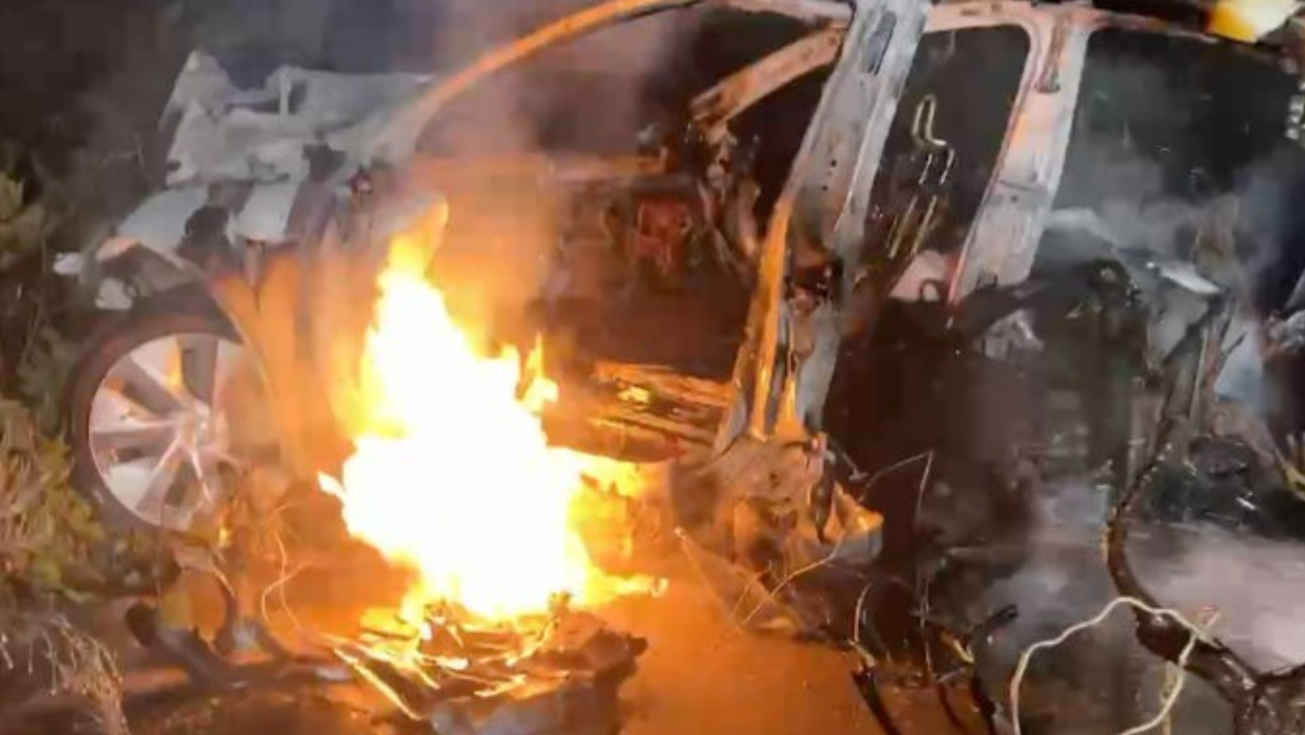特斯拉從國道1號墜落後斷成2截並起火燃燒,運安會調查結果出爐,當時車輛時速超過200公里。資料照,翻攝記者爆料網
