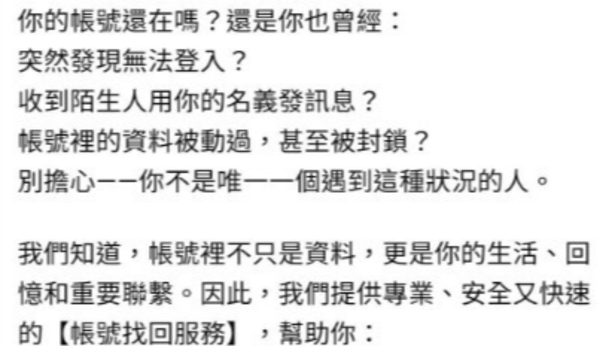 警方提醒,網路上聲稱可以破解帳號、解除封鎖或提供駭客服務的廣告,多數為詐騙陷阱。民眾若輕信付費,不僅可能遭受財務損失,也有個人資料外洩風險。