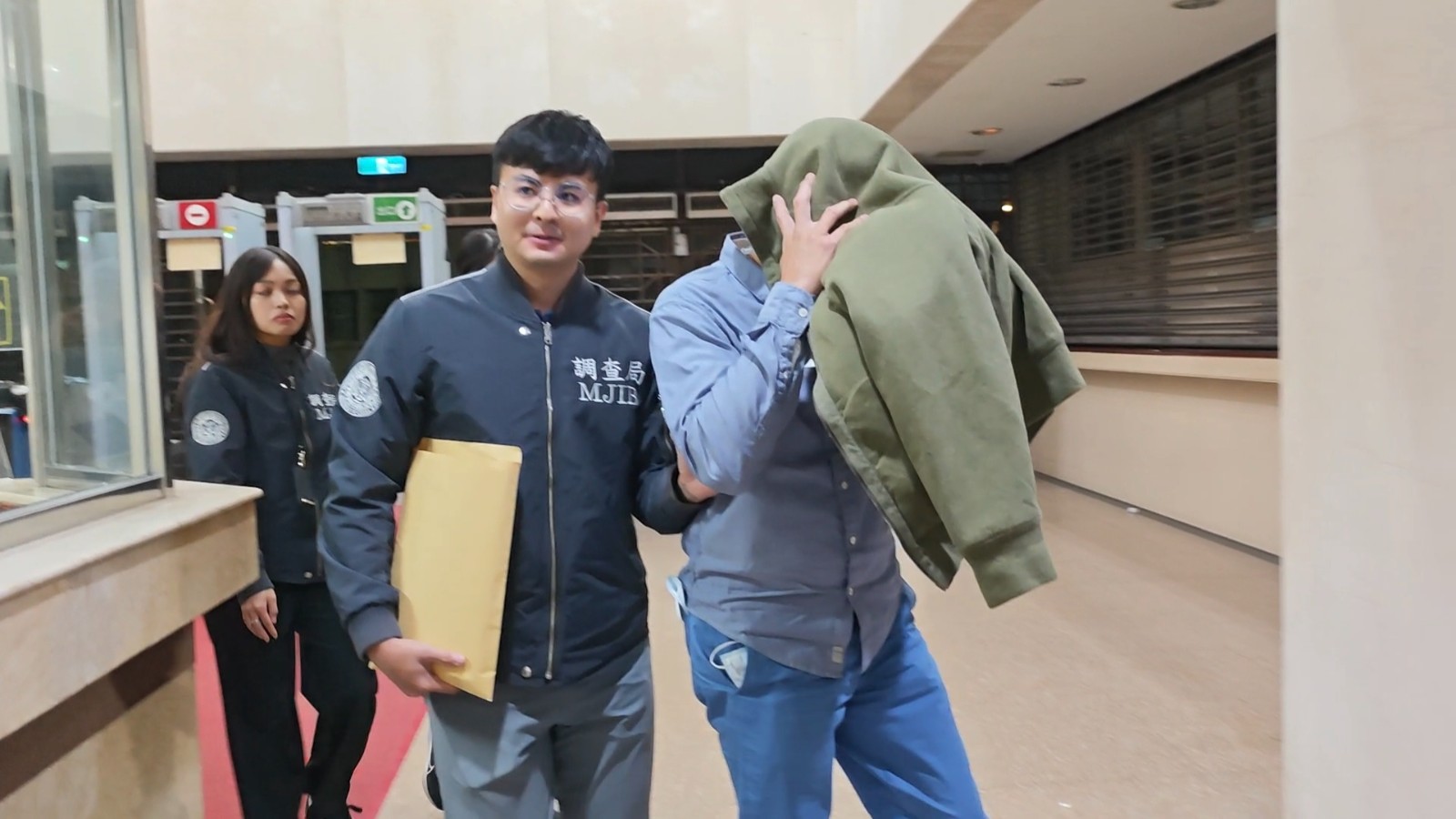 周方慰在調查人員陪同下走入北檢接受複訊時,直接以外套蓋頭不想被拍。資料照。呂志明攝