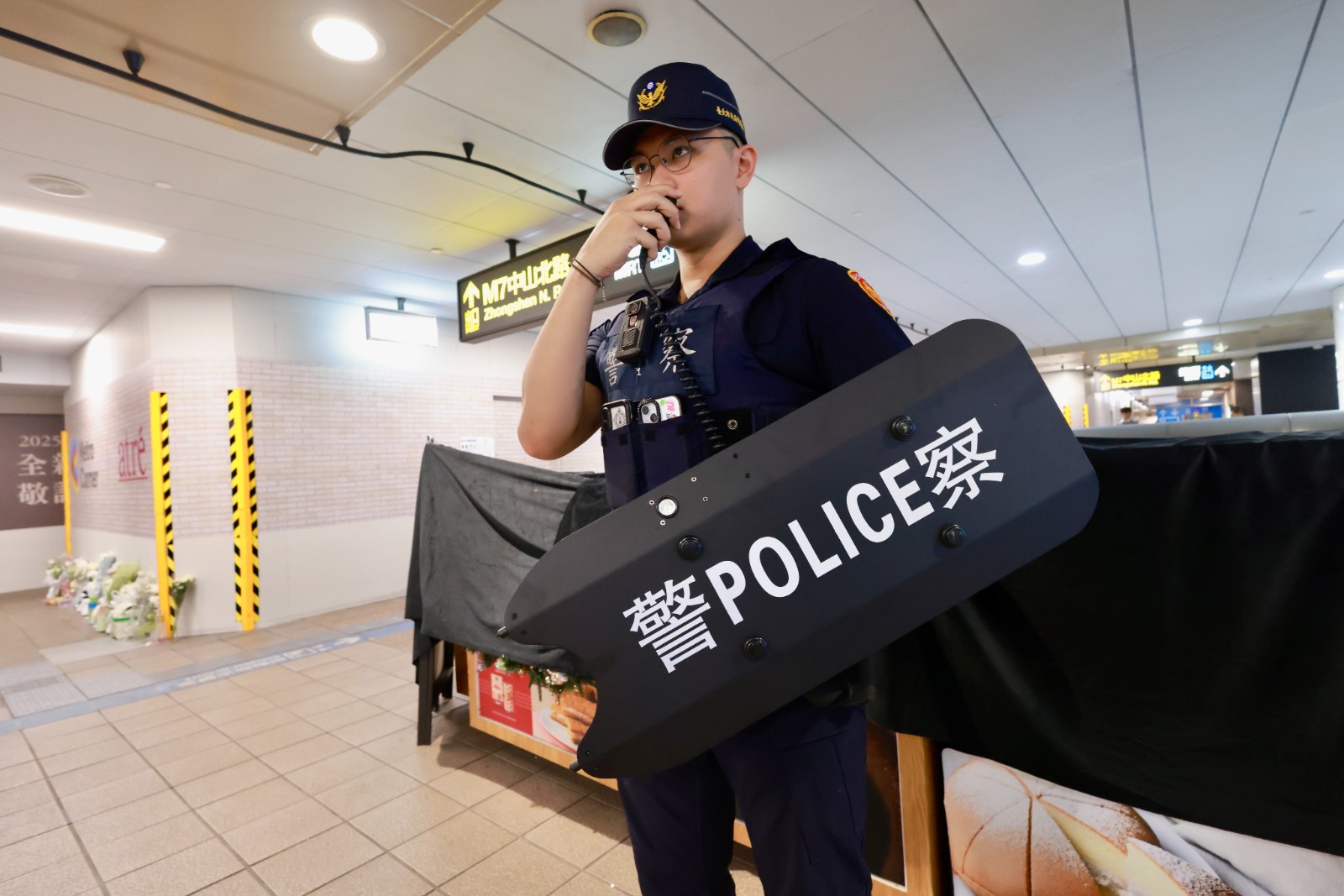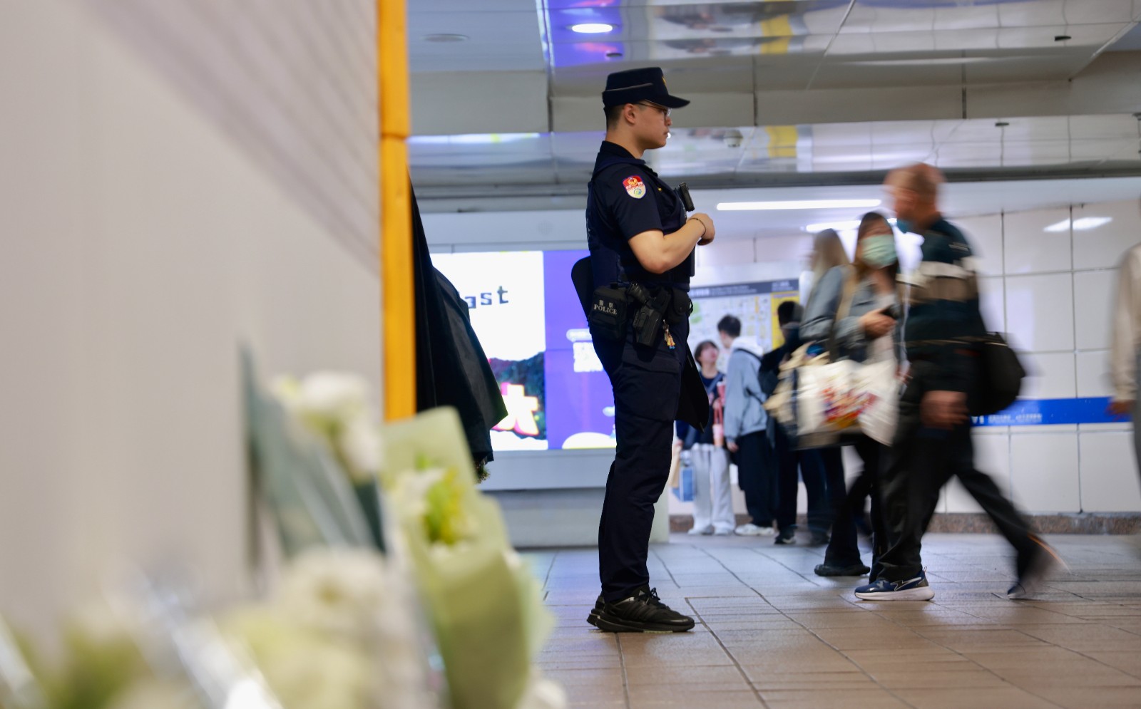 逃兵通緝犯張文犯下隨機攻擊案,北捷M8地下層民眾獻花,加派警力巡邏。李政龍攝