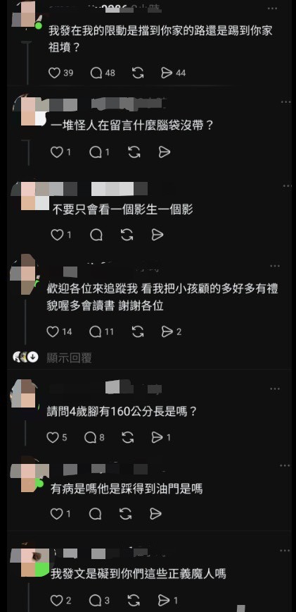 而上傳影片的家長發現事態演變,一連串反擊說「媽X正義魔人」、「我是踢到你家祖墳是嗎?4歲看起來採(踩)得到油門??腦子被驢踢??」、「一堆怪人在留言什麼腦袋沒帶?」、「請問4歲腳有160公分長事嗎?」、「我發文是礙到你們這些正義魔人嗎」,似乎認為女童沒有踩油門就沒有安全問題。