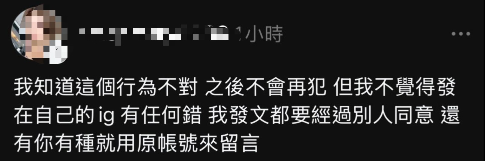 女童家長被撻伐後再次發文說:「我知道這個行為不對,之後不會再犯」,但她仍不覺得自己做錯事,「我不覺得發在自己IG有任何錯,我發文都要經過別人同意?」向揭發此事的原PO嗆聲說「你有種就用原帳號來留言。」態度再度讓許多人咂舌。