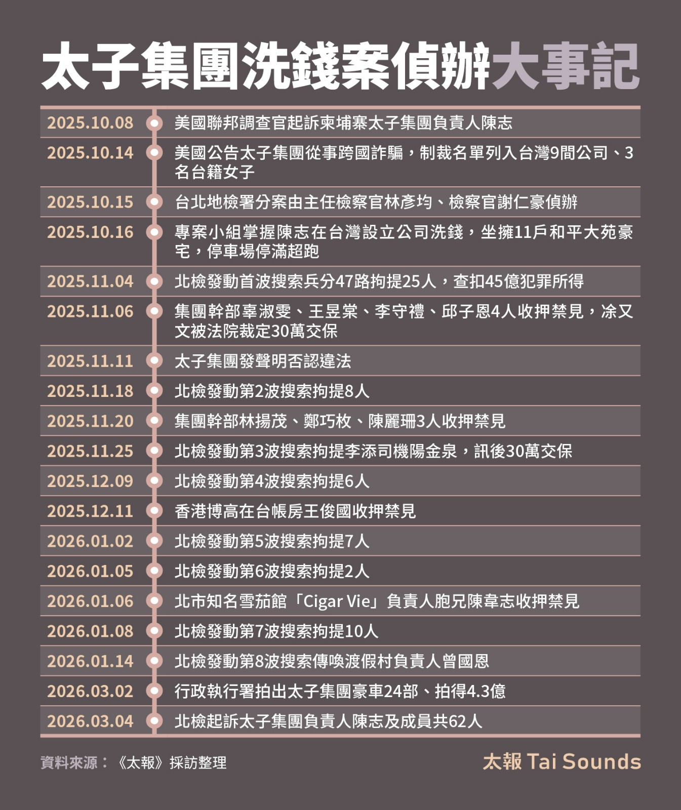 去(2025)年10月8日,美國聯邦檢察官起訴陳志等人,北檢也成立專案小組,除了查扣太子集團在台不法所得逾55億,並變價拍賣集團名下豪車,發動8波搜索,並羈押太子集團台灣重要幹部及吳逸先水房集團成員共計9人。