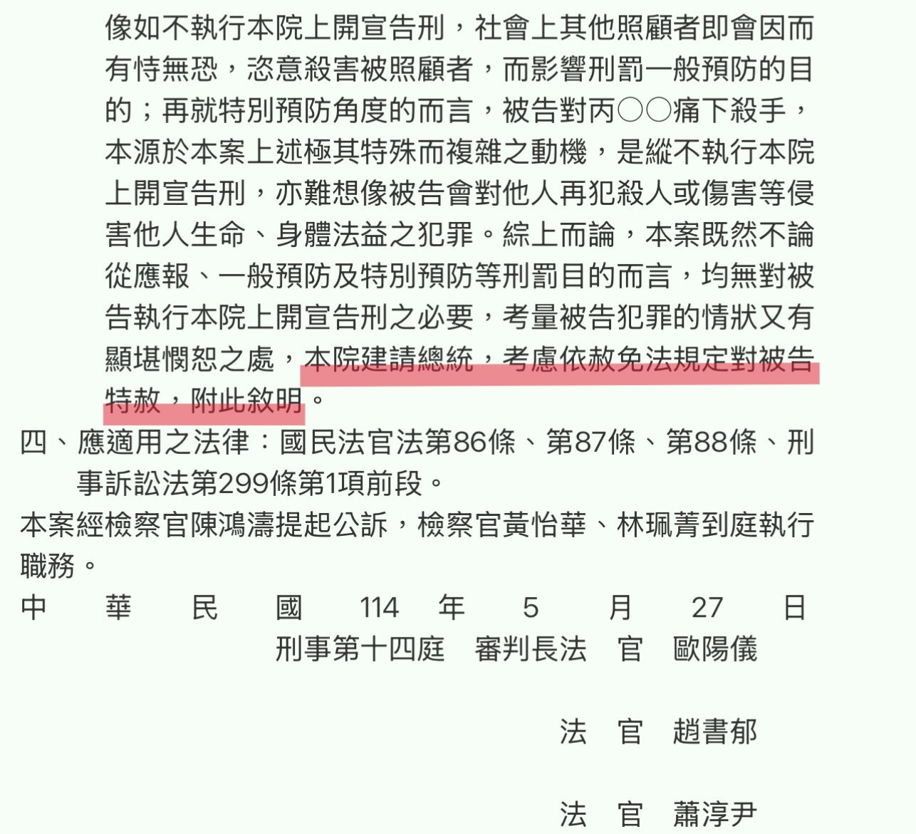 8旬劉婦照顧重度腦麻么兒長達50年,劉婦確診新冠肺炎住院,返家後換么兒確診,身心交瘁下,將1萬元紅包塞入兒子嘴巴後悶死。一審以最低刑度輕判2年6月,一審判決道盡「長照悲歌」的斑斑血淚,合議庭沉痛說,劉婦餘生的自責與傷痛「已是最大刑罰」,建請總統「特赦」。劉婦委任律師昨天於二審再度請命,法界人士瘋傳一審判決文,今同聲呼喊總統賴清德「聽聽大家聲音」。