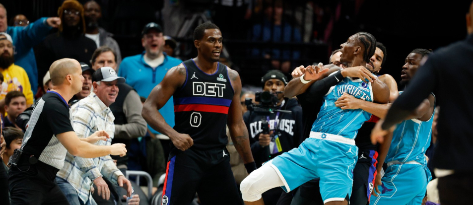 NBA東區龍頭底特律活塞今(10日)作客近況火熱9連勝的夏洛特黃蜂,沒想到兩隊在第3節上演「大場面」重圖場面,雙方4名球員遭驅逐出場,黃蜂總教練Charles Lee也在末節因為不滿裁判判決遭驅逐,終場活塞110:104踢館成功,斷了黃蜂的9連勝。