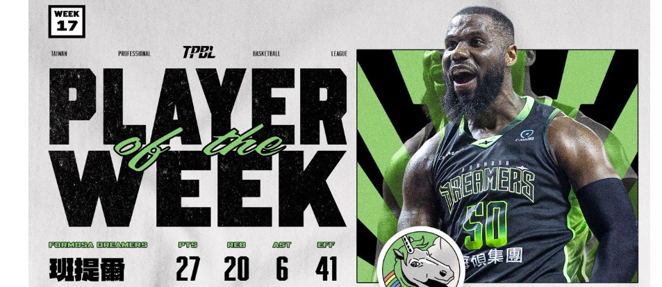 福爾摩沙夢想家洋將班提爾上週繳出極具統治力的表現,在關鍵對戰中帶領球隊北上擊敗臺北台新戰神,不僅幫助夢想家取得對戰四連勝,也憑藉全能數據,獲選為 TPBL 第十七週單週最有價值球員(MVP)。由於外型神似 NBA 球星 LeBron James,班提爾也被球迷暱稱為「夢想家詹姆斯」,而他在場上的全面身手,確實展現出宛如詹姆斯般的影響力與存在感。