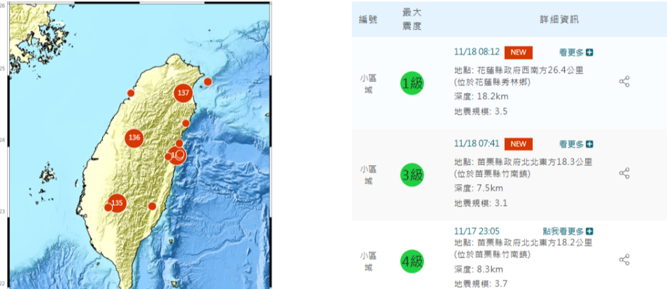苗栗縣竹南鎮從昨(11/17)日晚間至今(11/18)上午,短短8小時內連續出現3起有感地震,規模分別為芮氏3.8、3.7、3.1,因當地過往少有地震紀錄,引發民眾熱烈討論。地震專家郭鎧紋指出,此次群震源自「新竹前緣構造」的地底破裂,估計未來50年內,新竹前緣構造引發規模6以上的地震機率為1%。