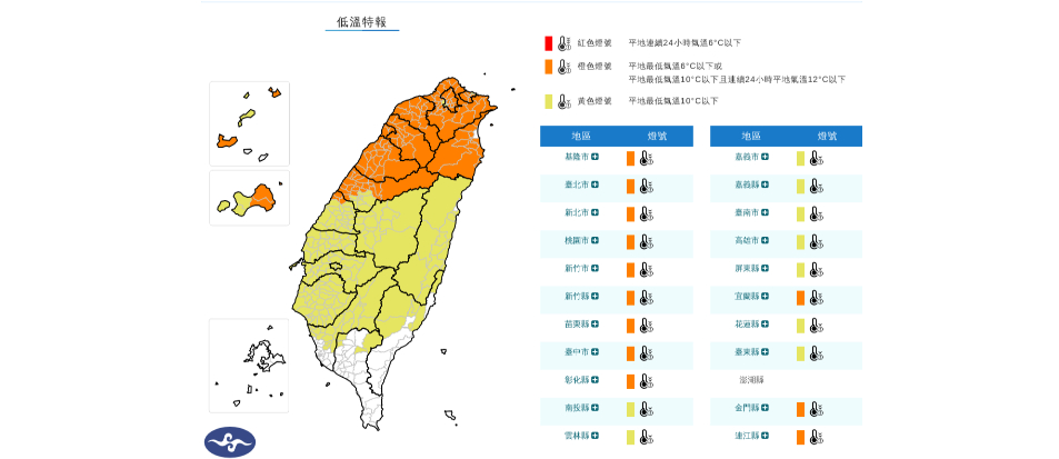 受到寒流影響,各地氣溫急凍,氣象署今(2/8)上午發布低溫特報,僅澎湖縣未列入,其餘21縣市皆有下探10度、甚至6度的可能。前中央氣象局長鄭明典則指出,台灣上空雲層變薄,日照使得降溫暫緩,但要注意輻射冷卻效應,「小心入夜後的低溫」。