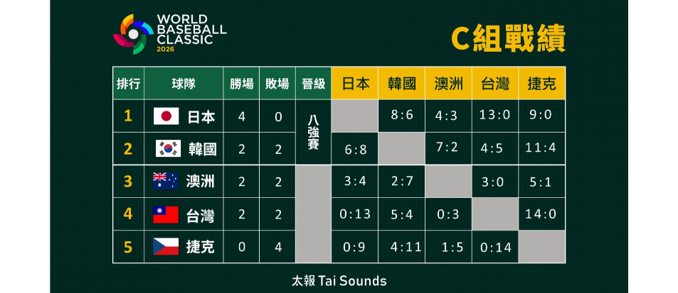 世界棒球經典賽(WBC)C組預賽在晚間捷克、日本之戰後畫下句點,雖然市場無關晉級的比賽但日本卻意外陷入苦戰,前7局竟1未得,直到8局下才靠周東佑京3分砲點燃打線,隨後村上宗隆再補上滿貫彈,單局鯨吞9分,最終9:0贏球,連2屆在分組預賽以4勝0敗全勝之姿前進8強。
