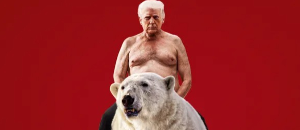 美國總統川普近日頻頻針對丹麥半自治島嶼格陵蘭出招,21日在瑞士達沃斯宣布達成框架協議。最新一期《經濟學人》雜誌封面照,合成裸露上半身的川普騎著一頭北極熊,分析川普對全球局勢造成的風險。