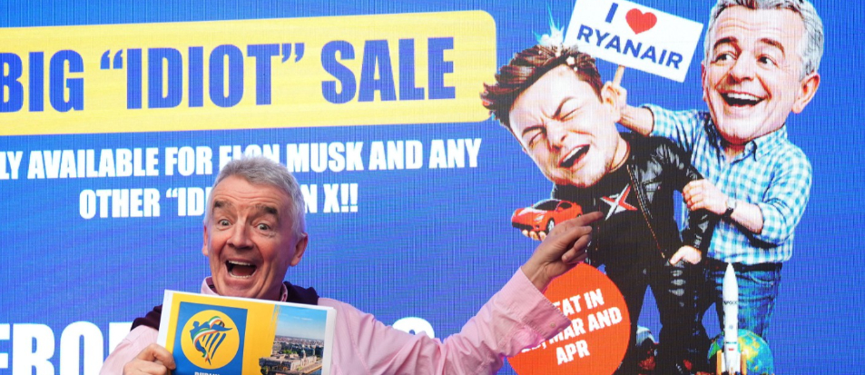 特斯拉執行長馬斯克(Elon Musk)近日舌戰歐洲最大廉價航空瑞安航空執行長歐萊瑞(Michael O'Leary),原因是瑞安拒絕在飛機上安裝星鏈系統,兩人互罵「白癡」。歐萊瑞腦筋一動,順勢推出「白癡特賣」,歐萊瑞21日感謝馬斯克,因為這一波活動讓過去5天業績成長2%至3%。