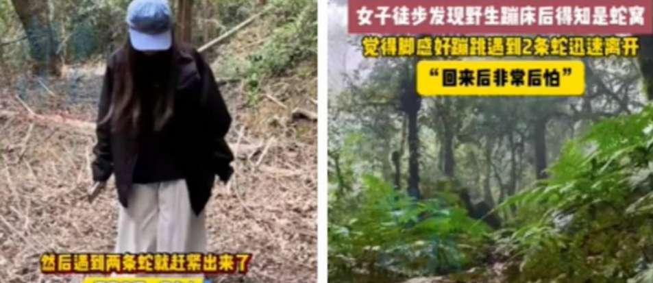 中國江西上饒一名李姓女子近日與友人入山健行時,誤將一處地面異常鬆軟的區域當成「天然彈跳床」,開心蹦跳嬉戲,未料腳下突然竄出兩條大蛇,嚇得眾人尖叫逃離。事後她才從網友留言得知,該處竟疑似是眼鏡王蛇的巢穴,讓她驚呼「後怕到不行」。