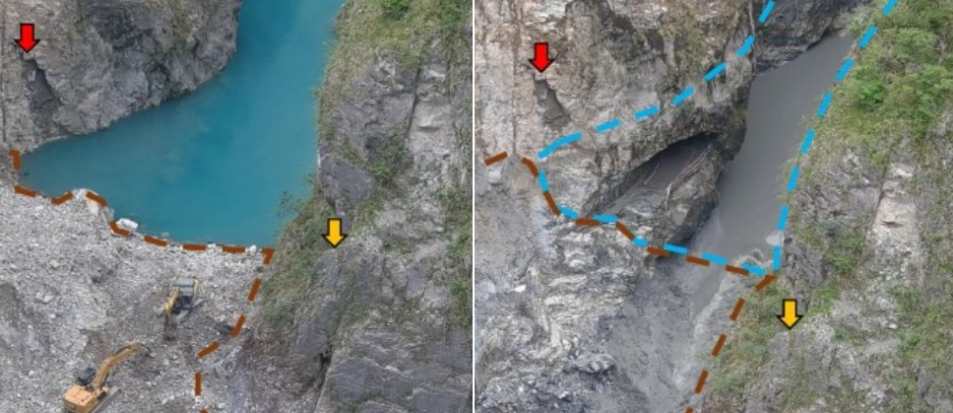 立霧溪燕子口堰塞湖17日形成後,隨即展開降挖引流作業,這幾天上游持續降雨,今(10/29)上午11時過後溢流增加,至11時40分幾乎完全潰決,所幸應變得當、未釀災情,下午4時20分正式解除警戒。林業署隨後曝光堰塞湖前後對比照,可見蒂芬妮藍湖水已經消失,靳珩隧道西口再度重現光明。
